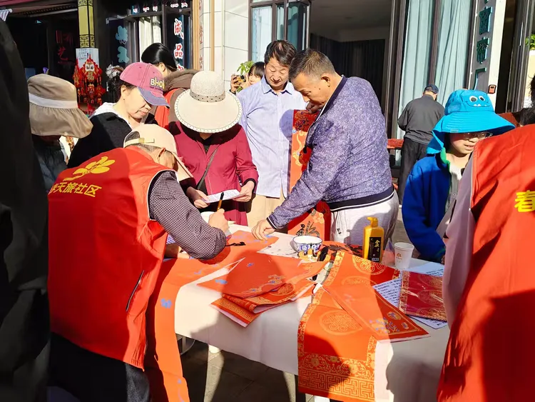 活动现场,一位旅居居民忍不住也提起笔,在红纸上工工整整写下一个“福”字,笔力遒劲亦别有一番风味。社区工作人员一边维持秩序,一边将墨迹未干的春联小心铺晾,红彤彤的纸页映着一张张笑脸,年味扑面而来。